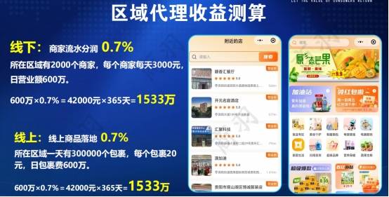 区县代理构建管道式收入:代理支/付平台使用费后,可享受区域内所有商家营业额的0.7%作为服务费。按一个区县年流水15亿计算,代理年服务费收入可达千万元级别,真正实现了“一次努力,持续回报”。